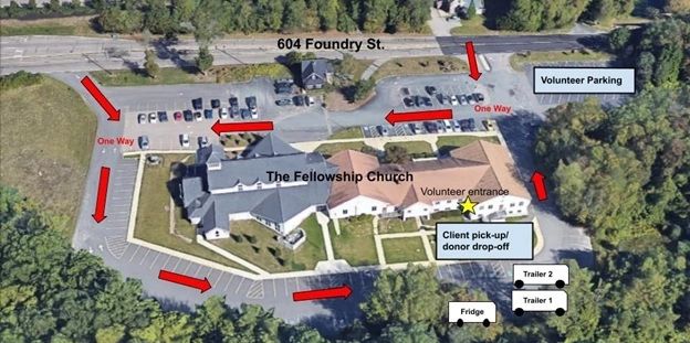 The Easton Food Pantry is open to all Easton residents. The food pantry is in the rear of The Fellowship Church and requests recipients to form a line in their cars circling around counterclockwise from the front of the church to the rear like in this diagram. Make sure your trunk is clear as volunteers will place food into your trunk. Call the food pantry at (781) 333-6284 at any time - messages are checked daily and returned as soon as possible.